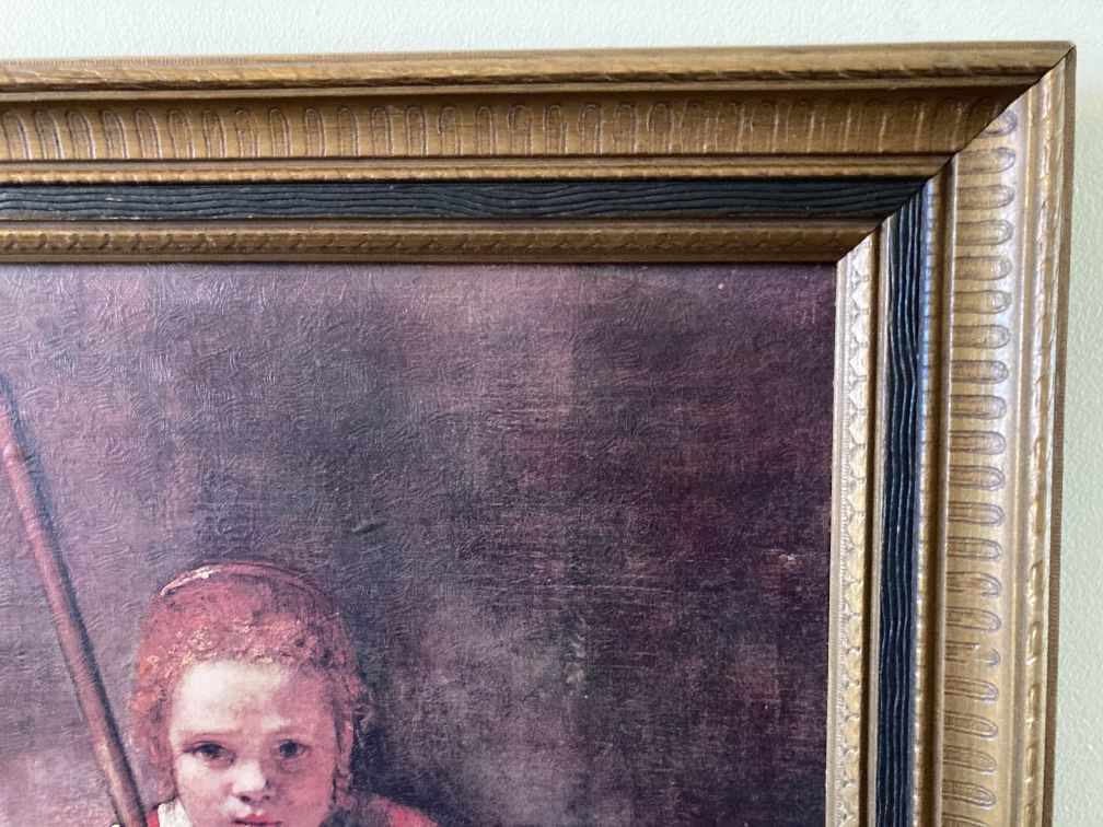 - Vintage reproduction art print on cardboard, wood exterior frame with a decorative plastic inner molding