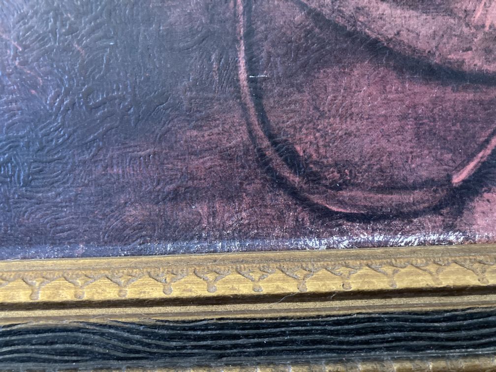 - Vintage framed reproduction art print of fair quality; in good displayable condition but with a little warp or tweaking to the frame which causes it to not lie completely flat against the wall, but still displays nicely; one slight indentation the size of a dime in the upper right quadrant (not noticeable unless looking for it). The paper backing is torn and taped around the perimeter. Nice but cheap framed fine art print gets you a classic piece of art at a fair price.