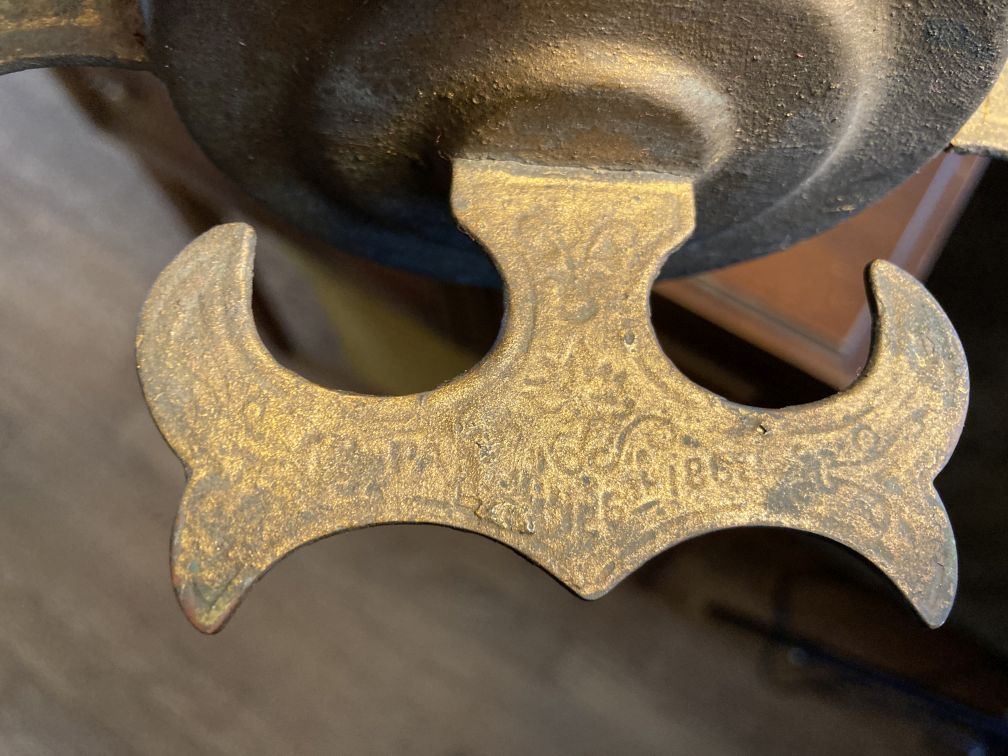 • The bottom finial of the harp is stamped with a patent date of April 6th, 1860(?), and a name, but unable to read...an ampersand is visible.  See pic.