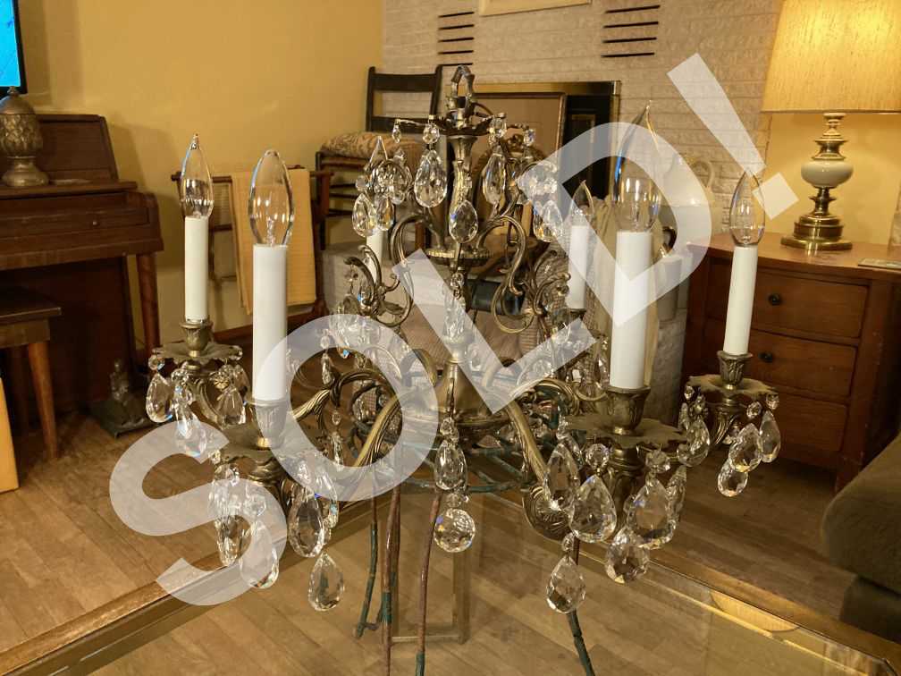 - Beautiful mid century brass and crystal chandelier in very good condition with light finish wear and tear. Brass base in very good condition with no damage; crystals all in good condition, nice and sparkling, no breaks, maybe a few that have a rough edge here and there; crystal wires are intact, though have wear from inserting and removing over the years; plastic candle covers are cheap replacements to the originals, and are chipped and crack at the top edges near bulbs--easily replaced if necessary; unknown if bulbs work or not--selling as is. As with all vintage electrical fixtures, this light should be inspected for safety prior to installation. Beautiful mid century brass and crystal chandelier features 6 lights, 6 arms, and 79 crystals. This beautiful chandelier was removed from a house built in 1968 and was an original fixture; see also the elegant brass and crystal sconces that we have listed that were paired with the chandelier and that were original to and removed from the same mid century house (included in some of the pictures here).