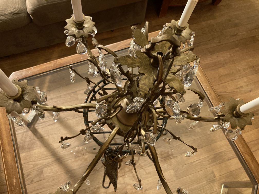 - Vintage brass and glass crystal chandelier has 6 arms, each with one candelabra candle light; 6 lights total